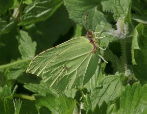 La Brimstone Gonepteryx rhamni, es un excelente ejemplo de disfraz. Está coloreada y tiene la forma de una hoja viva, con «venas» elevadas.